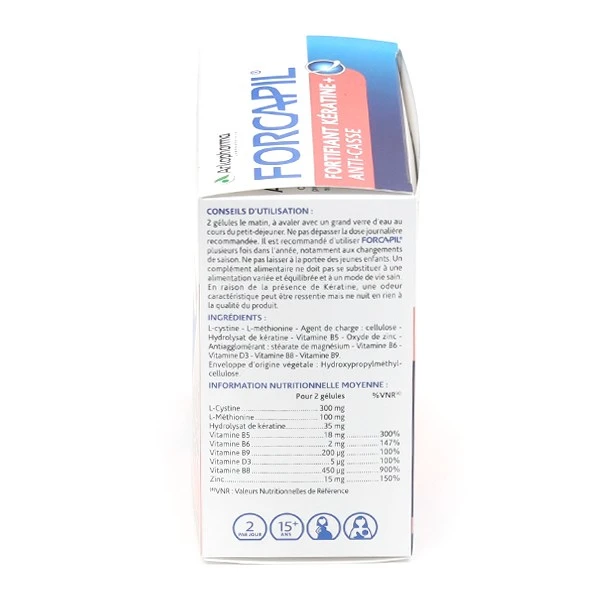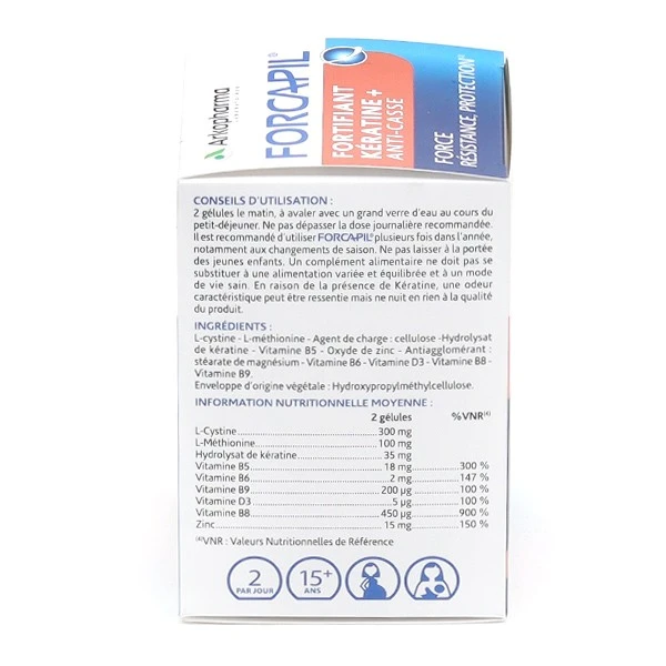 Forcapil Fortifiant Kératine + des laboratoires Arkopharma est un complément alimentaire à base de kératine bioassimilable, acides aminés, complexe vitaminique B et D, ²Zinc, pour la force, la résistance, la protection².