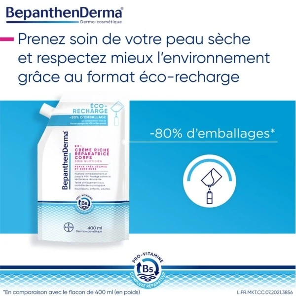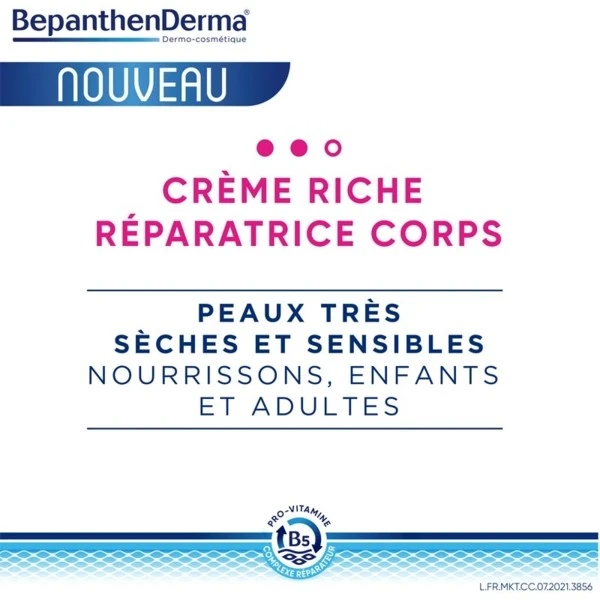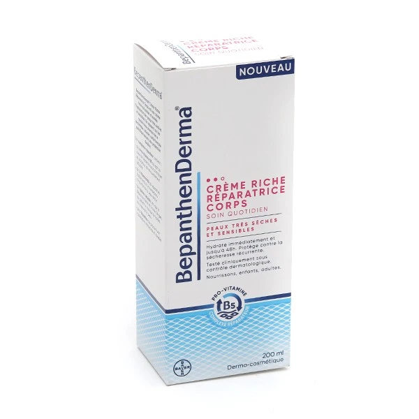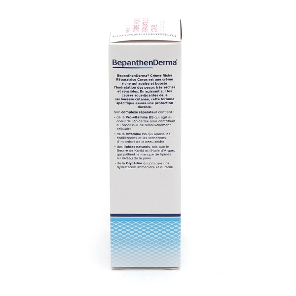 BepanthenDerma Crème riche réparatrice corps va soulager immédiatement la peau très sèche. Elle intègre aussi un complexe réparateur, association de pro-vitamine B5, de vitamine B3, de lipides et de glycérine.