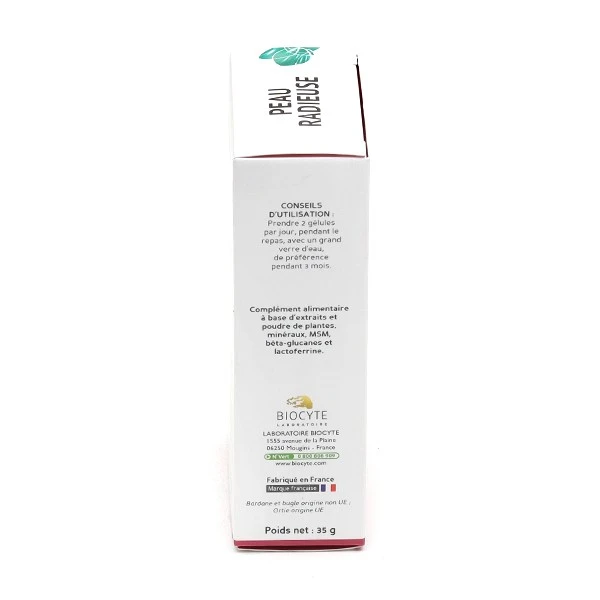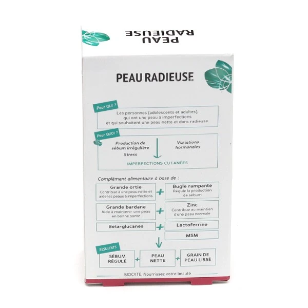 Biocyte Peau radieuse est un complément alimentaire à base d’extraits et poudre de plantes, minéraux, MSM, bêta-glucanes et lactoferrine. Ce complément alimentaire Beauté aide les peaux à imperfections, grâce à l’ortie.