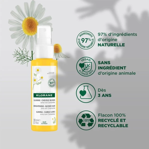 L’ingrédient phare de ce spray éclaircissant Klorane concerne la camomille , une plante largement plébiscitée pour ses vertus antioxydantes et anti-inflammatoires . Sa richesse en flavonoïdes et en coumarine en font également un véritable booster d’éclatpar effet de nutrition profonde des fibres capillaires. Elle contribue à réveiller les reflets naturels de la chevelure et à lui redonner sa luminosité. D’autre part, son action antioxydante, précédemment citée, pérennise cet éclat en protégeant les cellules ravivées de l’agression des radicaux libres tout en apaisant les irritations grâce à ses qualités anti-inflammatoires.