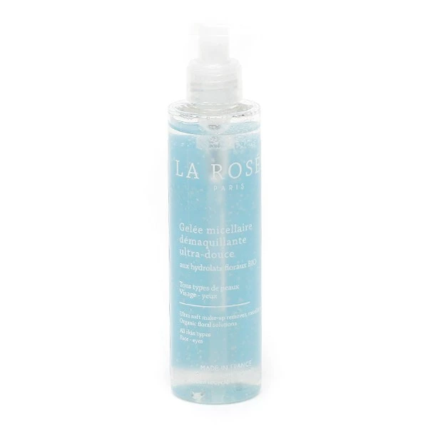 La Rosée Gelée micellaire démaquillante ultra-douce intègre trois hydrolats, tous bio : les hydrolats de rose de Damas et de camomille réputé pour calmer la peau et pour l’hydrater, et l’hydrolat de citron purifiant, qui apporte une agréable sensation de fraîcheur. Elle est formulée avec de l’extrait d’algue rouge qui va protéger la peau, et de l’aloe vera qui va régénérer la peau. Il possède également des vertus hydratantes.