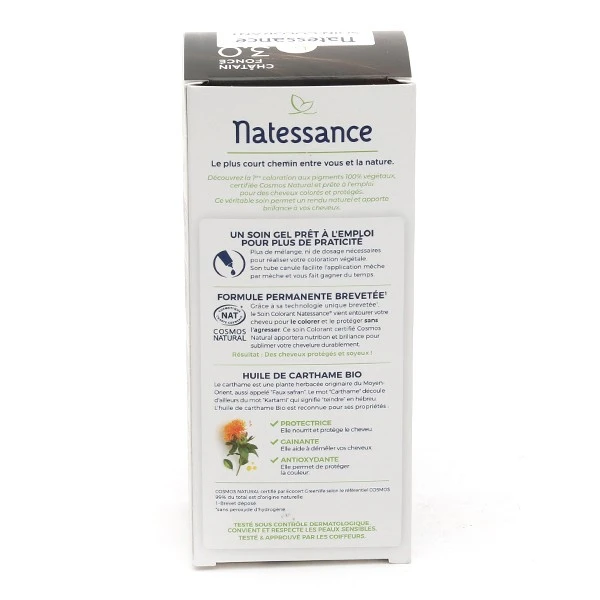 Enfin, Natessance Soin colorant Châtain foncé 3.0 intègre de l’huile de carthame, aux propriétés antioxydantes, qui va prendre soin du cheveu en le nourrissant et en le protégeant. Par ailleurs, elle facilite le démêlage grâce à son action gainante.