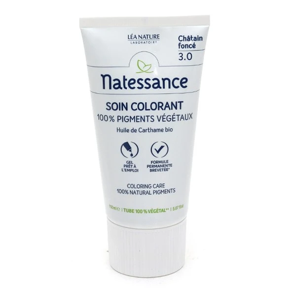 Natessance Soin colorant Châtain foncé 3.0 est pratique à appliquer grâce à son gel prêt à l’emploi, contenu dans un tube à canule permettant une application précise sur chaque mèche. Il n’y a donc pas besoin de réaliser des dosages ou des mélanges fastidieux. On veillera simplement à faire un shampooing purifiant avant l’application, et un shampooing après-couleur une fois celle-ci terminée et les cheveux rincés.