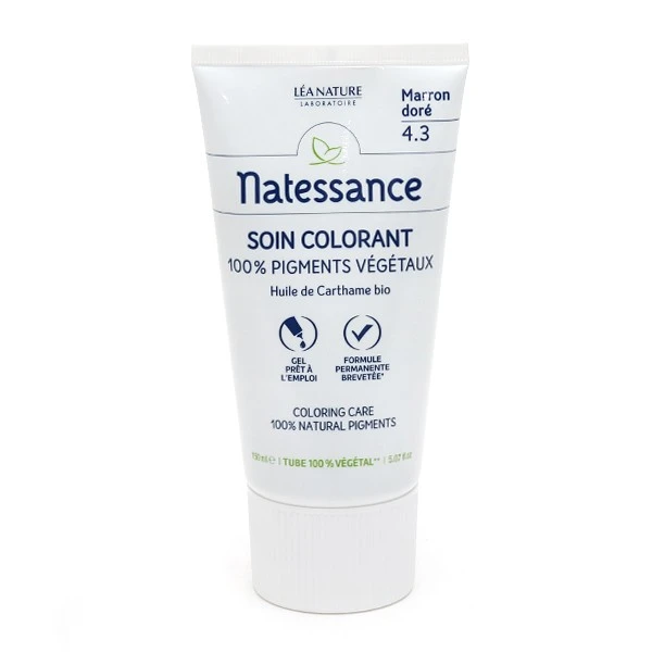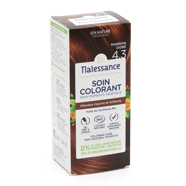 Le soin colorant marron doré 4.3 du laboratoire Natessance permet de réaliser une coloration naturelle des cheveux tout en préservant ces derniers des produits chimiques et en les nourrissant intensément. Il a été formulé à partir de pigments issus à 100% du monde végétal et d’huile de carthame bio aux nombreuses vertus nutritives. Il est d’ailleurs certifié Cosmebio. Sous la forme de gel, ce produit est prêt à l’emploi pour une application rapide et facilitée.