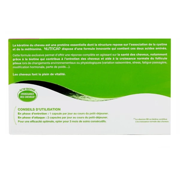 La kératine du cheveu est une protéine essentielle dont la structure repose sur l’association de la cystine et de la méthionine. Nutricap dispose d’une formule innovante qui contient ces deux acides aminés.