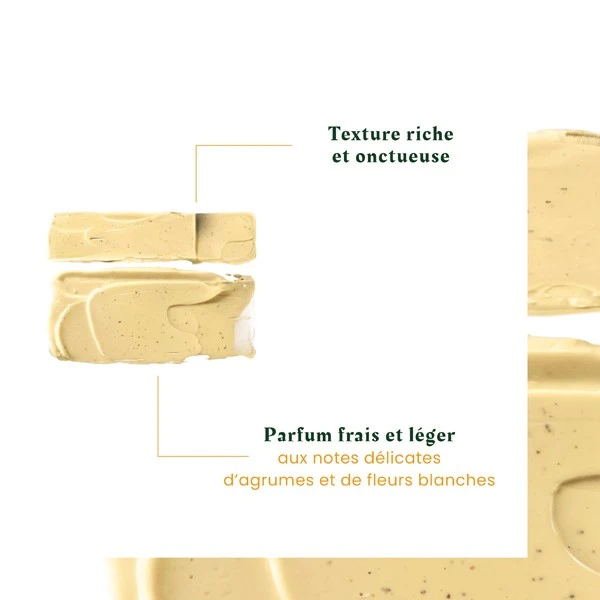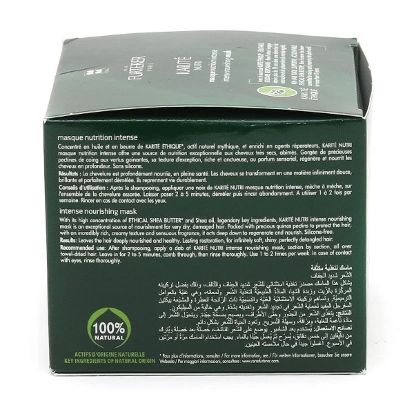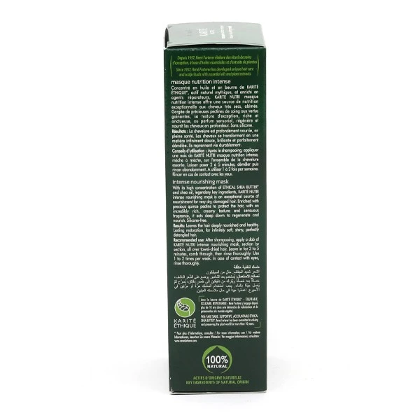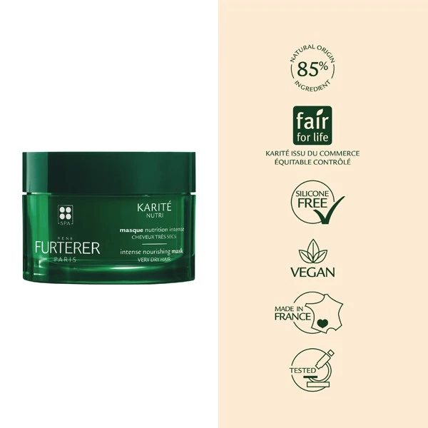 Comme son nom l’indique, le masque Karité Nutri est enrichi en beurre de karité. Cet actif mythique est issu d’un arbre qui pousse en Afrique et qui est utilisé depuis des millénaires pour sa richesse en agents nutritifs, régénérateurs et réparateurs. Ce masque contient également de l’extrait de coing, un fruit cultivé sur les bords de la Méditerranée dont les grains de pectine apportent un effet gainant et hydratant. Enfin, des micro-protéines de blé ont été ajoutées pour leur grande affinité avec la fibre capillaire. Elles vont se fixer sur la surface du cheveu pour lui donner ressort et résistance, réparer les dommages et protéger la chevelure des agressions quotidiennes qui la fragilisent et l’assèchent (pollution, poussière, conditions climatiques).
