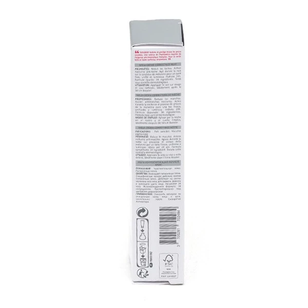 Cette crème correctrice contient notamment du nonapeptide-1, un ingrédient qui va agir directement sur les mélanocytes, les cellules responsables de la coloration de l’épiderme, afin d’empêcher la formation de nouvelles taches et de réduire celles qui sont déjà présentes. Il contribue à améliorer l’aspect de la peau en éclaircissant les taches et en diminuant leur taille. L’action hydratante et nourrissante de la crème est quant à elle apportée par la glycérine présente dans la formule.