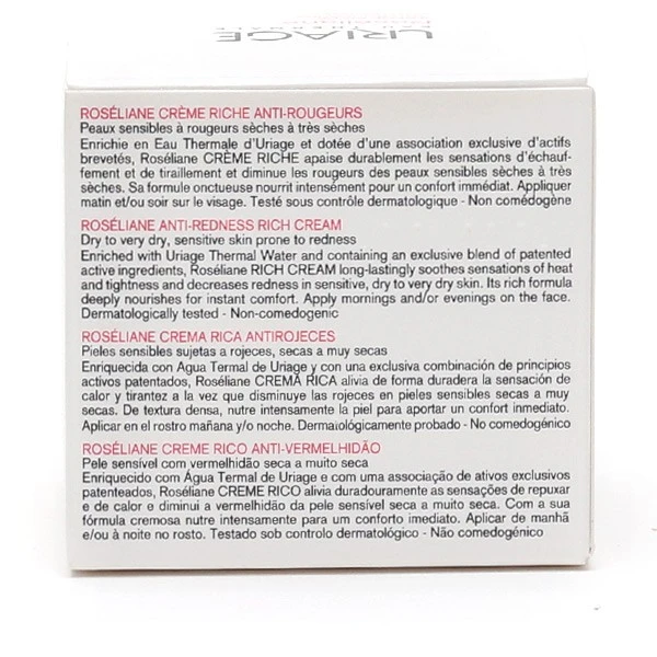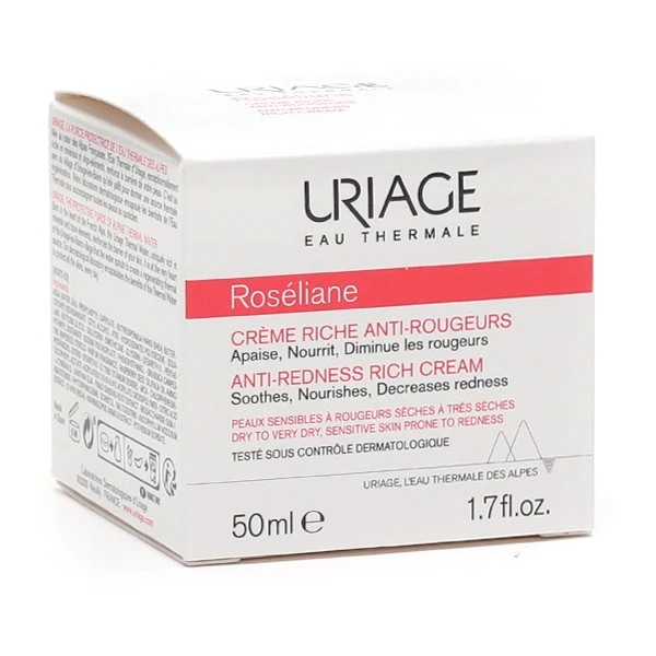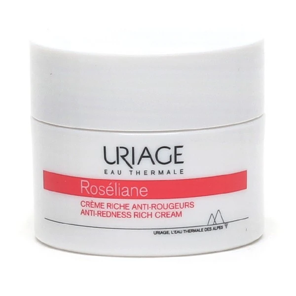 La crème riche anti-rougeurs Roséliane est un soin visage conçu par les laboratoires Uriage. Elle s’adresse aux peaux sèches à très sèches, sensibles et sujettes aux rougeurs occasionnées notamment par la couperose (aussi appelée rosacée). Cette crème hydrate et nourrit intensément la peau, répare et renforce le film hydrolipidique. Elle soutient également les défenses naturelles de l’épiderme et fortifie les parois des petits vaisseaux sanguins pour atténuer les rougeurs.