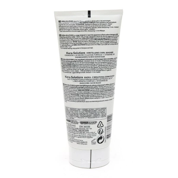 Le masque 2 min réparateur de la gamme Dercos Technique Kéra-Solutions a été élaboré par les laboratoires Vichy pour réparer les cheveux abîmés par les agressions. Il contient de la pro-vitamine B5, un actif réputé pour son action régénérante sur les cheveux. Il restaure la fibre capillaire endommagée grâce à sa formule micro-comblante et son complexe-pro-kératine. Il agit sans alourdir les cheveux. Ceux-ci retrouvent leur force et leur douceur. La chevelure redevient lumineuse, elle est à nouveau facile à démêler.